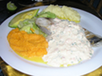 RECETA: SIERRA EN SALSA BLANCA CON PURÉ DE PAPA Y AHUYAMA |