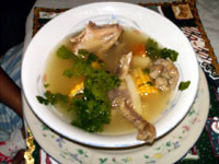 La Gallina es un ave muy típca y muy rica en sabor y nutrición. Se compra viva y s emanda a matar, pelar y a partir en cortes. En una olla grande se coloca agua con cebollas, ajo porro, pimentones, apio españa, ajo, zanahoria, jojotos tiernos y al hervir se coloca la gallina. Se deja que allí se vaya ablandando. Se lecoloca sal, pimienta y se va revisando hasta que de su punto de blandura y sabor. Se sirve en plato hondo con una rama de cilantro y jojoto. Es recomendable que no quede muy blando, pues es sabroso morder la gallina. |