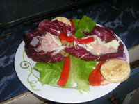 Trabajaermos con repollo morado y lechuga criolla. Se desinfectan muy bien (Se sumergen en agua y vinagre) Aparte se coloca en un sartén un poquito d emantequilla y aceite d eoliva y al calentarse se ponen tiras de pimentón rojo y se deja que suden. Se toman aceitunas rellenas con almendras, jamón picado y queso paisa. Todos e mezcla con jugo de naranja, sal y pimientas. Se coloca el repollo y la lechuga estirada en cada plato y encima se colocan los demás ingredientes. Se acompña con casabe de galleta o pan. |
