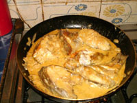 De la tierra el cordero y del mar el mero. Hoy degustremos un exquisito mero. Con la cabeza y la cola se hace un fumé o caldo blanco. Con la rodajas de mero se, toma una a una y se salan. Además de olocvarlas en una agua de limón, por una media hora. Luego en un caldero (ver foto) se pica cebolla, pimentón, ajo y allí se empieza a sudar con una cerveza. Cuando ya está más o menos blando se le grega crema d leche y queso parmesano rallado. Se termina de cocinar y se sirve con arroz o casabe. |