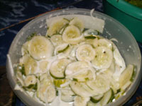 Se acercan los calores de la Semana Santa y nada mejor que una ensalada de pepinos. Eso sí, bien grandes y verdes. Se limpian muy bien y se rebanan. Se meten en agua con limón, sal y azúcar. Se dejan allí un buen rato. Lo mismo la cebolla en rodajas bien finas. Se escurren, sin botar el líquido de la maceración. Se toma un poco de yogurt natural y se mezcla con ricota y se le unen los pepinos y las cebollas. Poco a poco se le va agregando el líquido y se va probando hasta ajustar el sabor. Acompña a todos plato y va muy bien con pescados. |