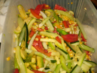 Se lavan muy bien estas excelentes verduras: se pican en tiras el pepino (con concha), pimentón rojo, aguacate, calabacín. Se pasan por agua caliente para mantenerles ese color natural dejan en agua de sal para que vayan tomando cuerpo y sabor. Aparte se hace una vinagreta con aceite de oliva, sal, pimienta, limón y balsámico. SE agita muy bien para que emulsione y luego en un envase se coloca maíz en granos y se coloca todas las verduras en tiras y se legrega la vinagreta removiendo todo para ques e impregne perfectamente.