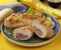 Lavar bien las pechugas y dejarlas en una marinada de limón, sal, moztaza y pimienta. Escurrirlas, abrirlas por el centro y rellenarlas con jamón y tocineta. Pasarlas por un poquito de aceite caleinte para doralas y luego llevarlas al horno tapadas con palel de aluminio y luego destaparla sind ejarlas secar.