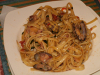 Se limpian muy bien las almejas, el pulpo y los calamares. El pulpo se coloca en un aolla con agua a ablandar. Luego se pca en trozos, al igual los calamares, las almajesa se dejan en agua para que vayan botando la arena. En un caldero se coloca cebolla, ajo, pimentón rojo y suficiente tomate en cubos. Se sofríe y al estar transparente se coloca los furtos del mar. Se le agrega pasta de tomate, perejil, pimienta, sal y aparte, se hace la pasta al dente, la c ual se trae y se termina en la salsa con los frutos del mar. |