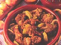 Después de unas cuantas horas. Ponga un sartén y coloque cebolla, ajo y pimentón, dñejelo sofreír. Luego coloque la carne en trozos, cuando esté dorada la carne agregue limón y algunas cascaras (Pocas), aceitunas, el liquido de la marinada y deje concina a fuego lento hasta que se ablande. |