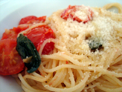 Se coloca en la olla suficiente agua, con sal y algunas hojas de laurel. Al hervir se coloca la pasta (larga) Aparte en un sartén mantequilla y un poquito de aceite de oliva. Cuando esté fundido añadir los tomates cherry, subir el fuego y remover hasta que los tomates estén blandos. Apagar el fuego y tapar. Escurrir la pasta y echarla al sartén con los tomates. Remover bien y añadir la albahaca. Poner en una fuente y añadir sal y pimienta negra. Echar el queso parmesano encima. Servir. |