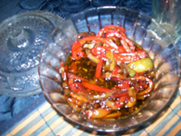 Se cortan en tiras pimentones verdes y rojos. En un caldero se coloca aceite de oliva y mantequilla. Cuando esté caliente se echan los pimentones y se dejan sofreír un poco. Luego se hace una mezcla de salsa de soya, sal, pimienta y azúcar. Se agrega al caldero y al hervir se apaga. Se deja reposar y acompaña perfectamente un buen pescado o un sabroso pollo a la plancha. |