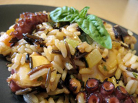 Picamos zanahoria, calabacín, ajo y cebollín. Llevamos esto al sartén con aceite hasta ablandarlos, agregamos pasta de tomate y mezclamos. Luego incorporamos los trozos de pulpo con polvo de pimentón, sal y pimienta dejando tomar color y que se mezclen bien todo. Se incorpora el arroz y se deja sofreír, para luego agregar un caldo de pescado y dejarlo cocinar a fuego lento. |