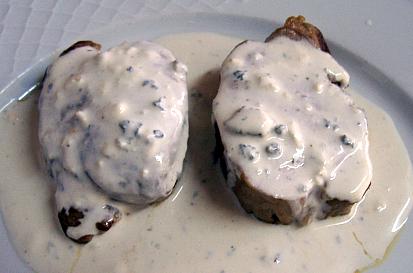 El solomo se deja con sal y pimienta. Luego en un sartén con mantequilla y aceite para sellar el solomo. Llevamos al horno por 10 minutos para que aparte mezcle queso crema con yogurt natural. Lo colocamos en el fuego para que espese. Cubrimos el solomo con la salsa y servimos.