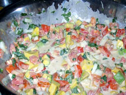 Esta ensalada tiene tiene la magia de las Navidades y la alegría del Nuevo Año. Se prepara en un envase un poquito de mostaza, crema de leche, jugo de limón, mostaza en grano molida, pimienta, sal y se bate muy bien. Aparte se hace un picado de tomate, lechuga repollada, aguacate y perejil. Se mezcla todo. Se presenta encima de una lechuga criolla y acompaña carnes o pescados.