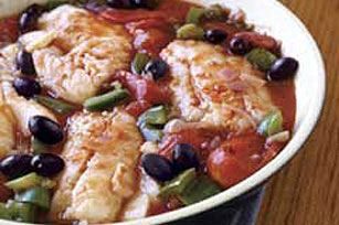 La cebolla se sofríe y luego se le coloca un aderezo de tomate licuado, orégano, ají dulce, sal, pimienta. Eso se hace en un sartén grande. Se le agrega pimentón y las aceitunas negras. Se colocan los filetes y se cubren con esta salsa. Se cocina tapado a medio fuego. Antes de servir se espolvorea con queso. |