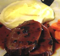 Corte el lomo en medallones anchos y acomódelos en una fuente. - En un bowl coloque el romero, la hoja de laurel, los granos de pimienta, salsa inglesa, los dientes de ajo pelados y machacados y caldo de carne, mezcle y vierta la marinada sobre los medallones de lomo, reserve en la heladera durante aproximadamente 2 a 3 horas.